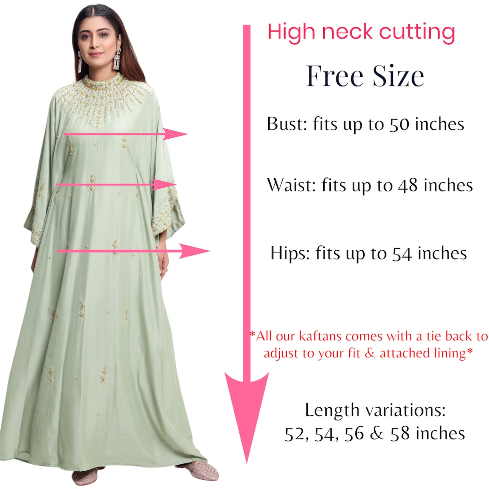 Juliette Series features a high neck design with stunning gold stonework and a fusion of pearls. It is available in a free size and can comfortably fit up to a 50-inch bust. The dress also comes with an attached inner layer and a silk blend tie back for added elegance.