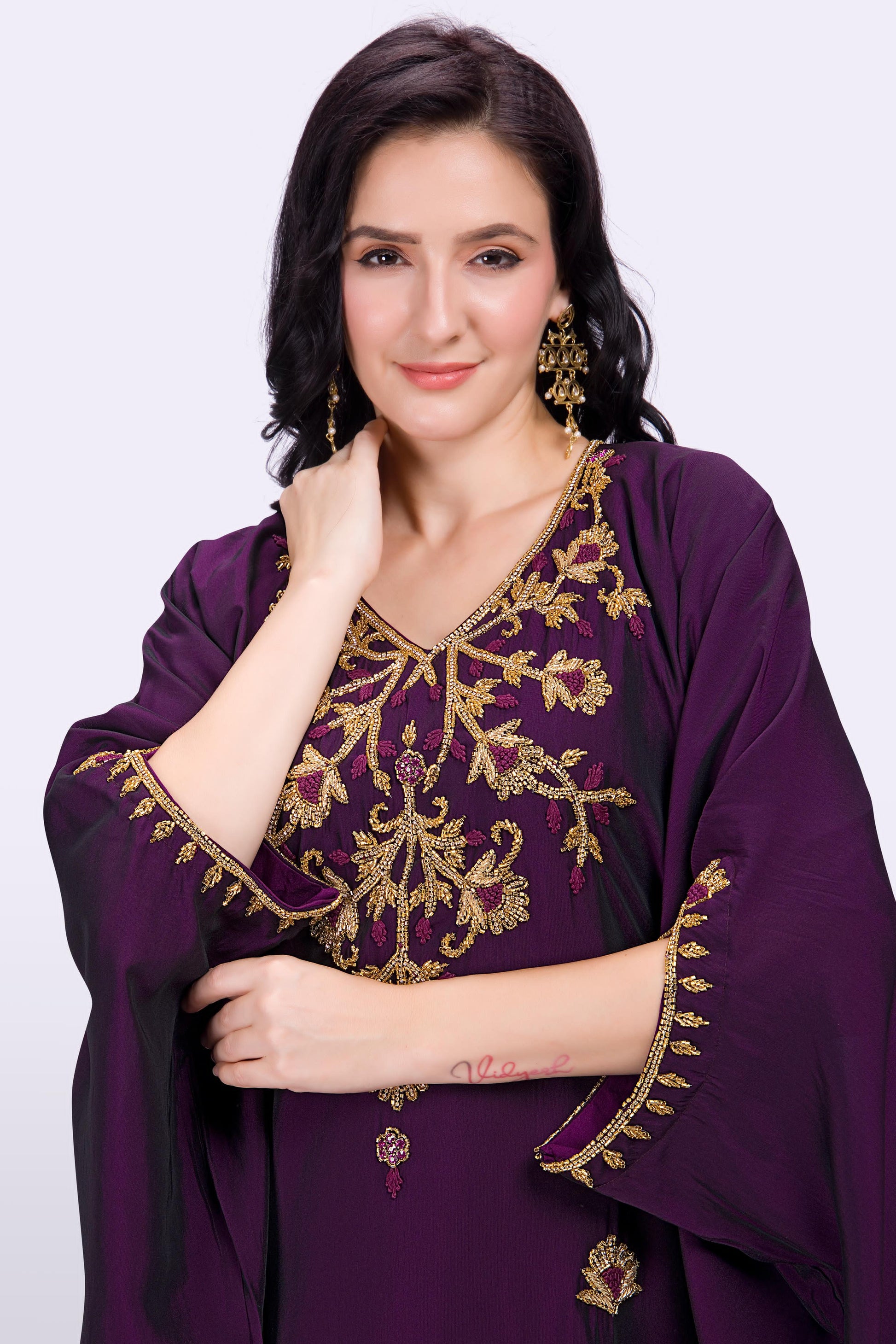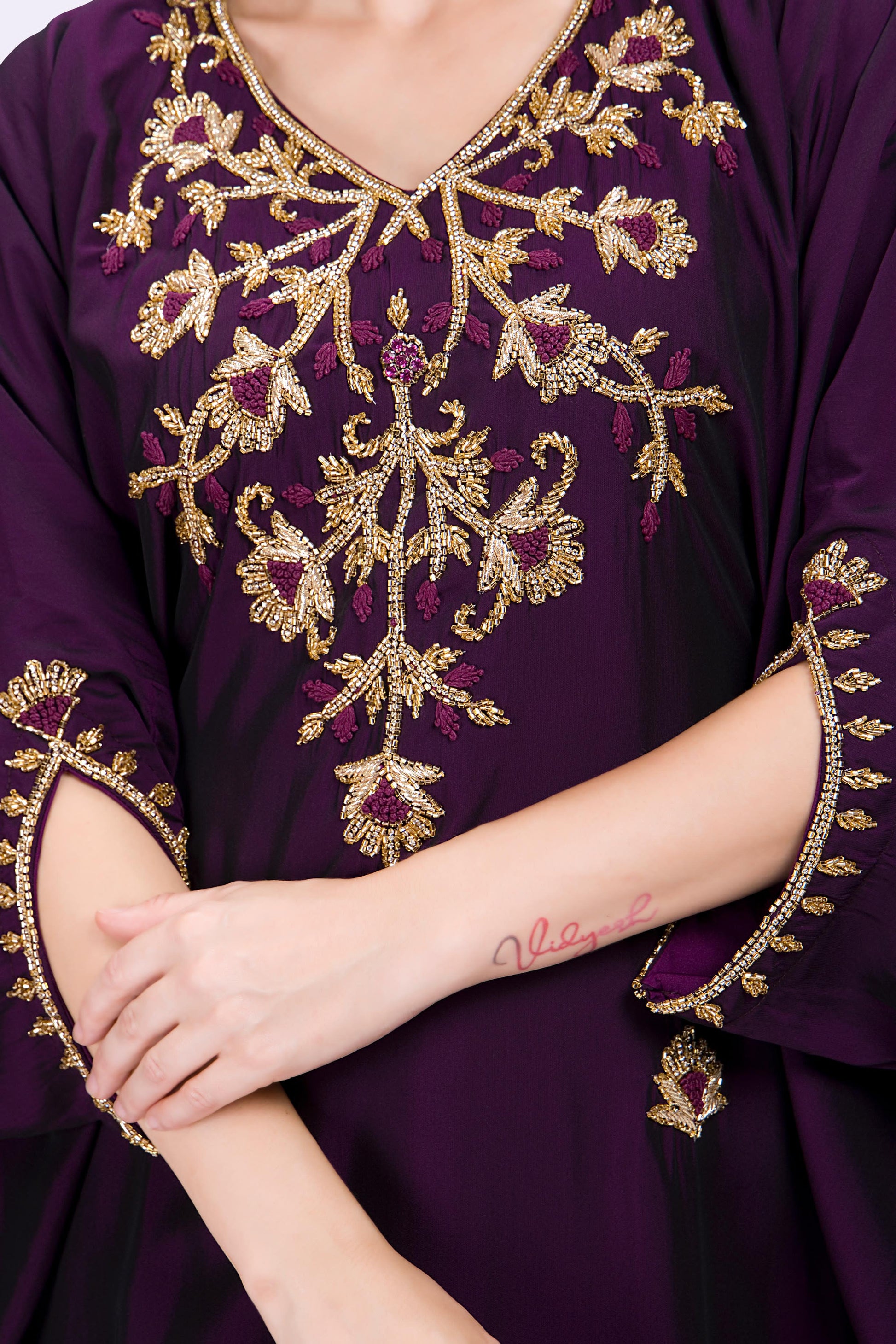 Maven Series- "The Maven Series in deep purple exudes an air of sophistication with its intricate gold bead and threadwork. The 3/4 sleeves and v-cutting add a touch of elegance, while the attached inner and tie-back allow for a customizable fit. Elevate your style with this luxurious piece.