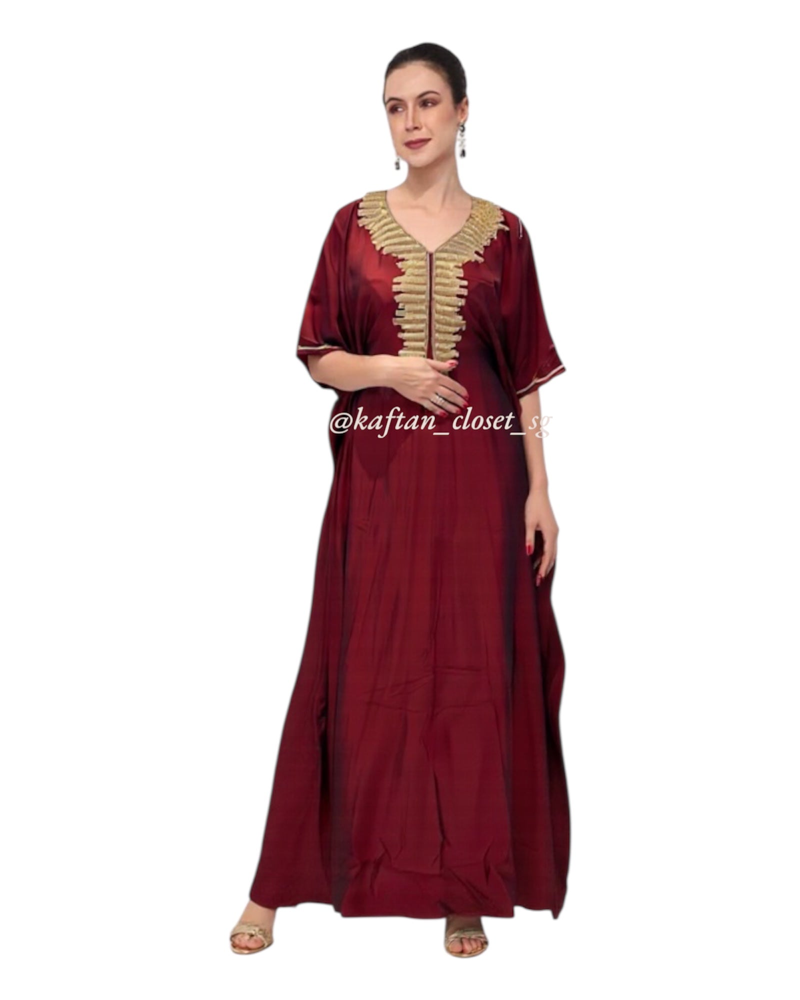 Introducing Nova, the perfect nursing-friendly kaftan in a beautiful maroon color. Its convenient zipper in the front and adjustable tie back make it both stylish and practical. Stay comfortable and chic with Nova short sleeves with attached inner.