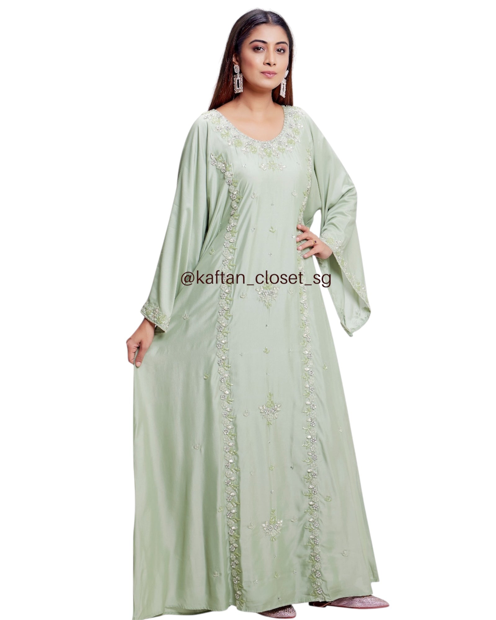 Indulge in luxury with the Ophellia Series. Adorned with elegant white stonework and matching stones, this panel elongated style boasts flair sleeves and a tie back to adjust to you fit. Kaftan fits up to 52 inches bust. Elevate your wardrobe with sophistication.