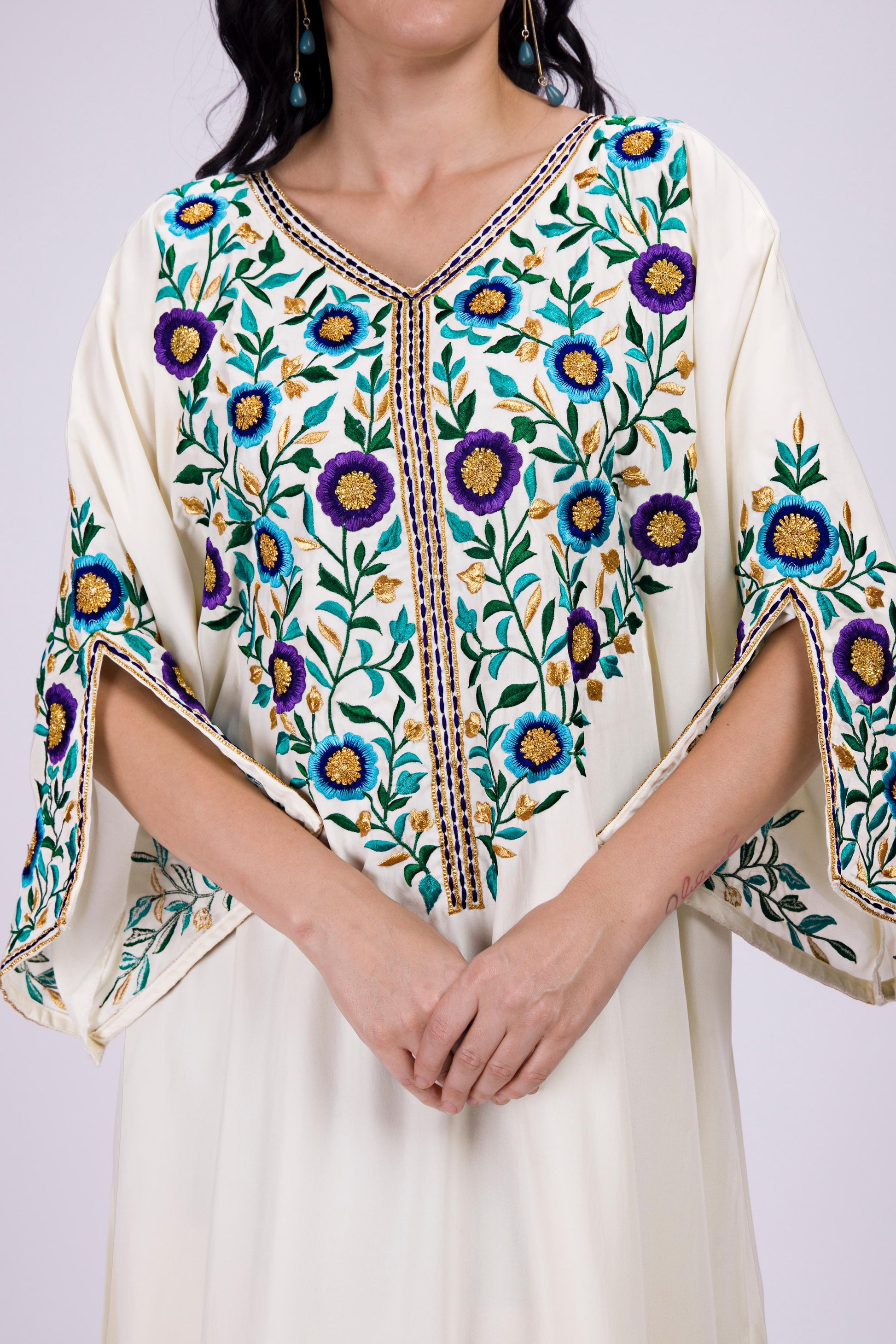 Expertly crafted with exquisite threadwork, this kaftan features delicate peony designs and a boho style. The attached lining provides both comfort and versatility. With a free size that fits up to 50 inches bust, this kaftan is perfect for any occasion.