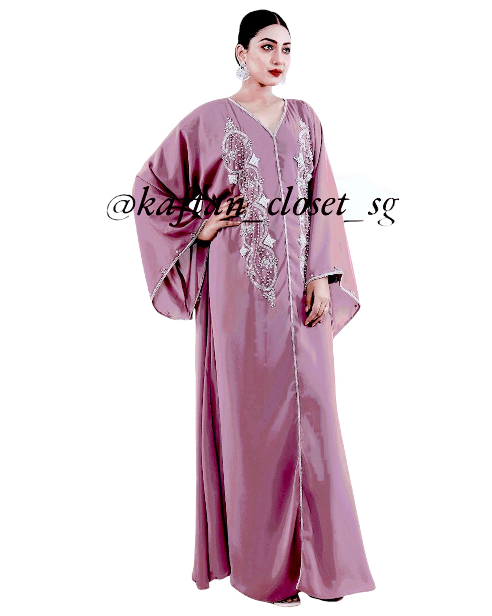 Elevate your style with the Tiara Stonework & Metallic Threadwork kaftan. The V-neckline and flared sleeves offer a flattering silhouette, while the chiffon blend fabric ensures comfort. The silver and white stonework with metallic threadwork adds a touch of elegance. Available in free size, it fits up to a bust of 48 inches and comes in various lengths.