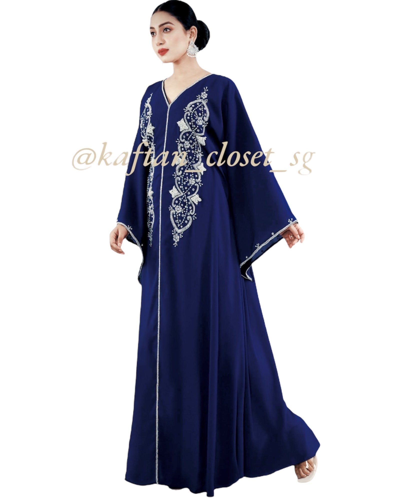 iElevate your style with the Tiara Stonework & Metallic Threadwork kaftan. The V-neckline and flared sleeves offer a flattering silhouette, while the chiffon blend fabric ensures comfort. The silver and white stonework with metallic threadwork adds a touch of elegance. Available in free size, it fits up to a bust of 48 inches and comes in various lengths.